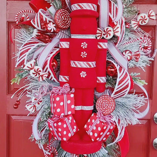 Make your holiday décor unforgettable with this stunning handcrafted Christmas wreath! Featuring a bold red nutcracker surrounded by frosted pine, candy-striped ribbons, peppermint accents, and shimmering red ornaments, this piece captures the magic of the season in true festive style.