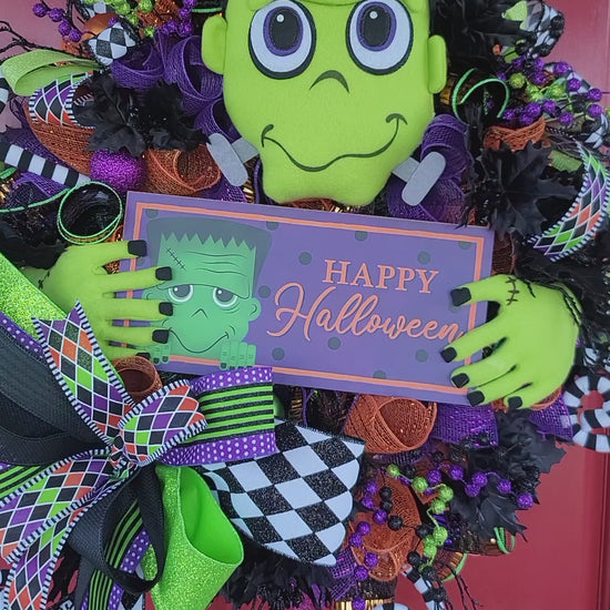 This festive Halloween wreath features a fun and whimsical Frankenstein’s monster theme. At the center is a large, plush green Frankenstein head with big, friendly eyes and a stitched smile, holding a cheerful sign that reads “Happy Halloween” in orange and purple with a cute cartoon version of himself.