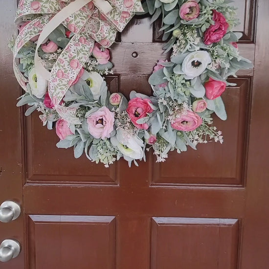 Bring a touch of timeless beauty to your home with this handcrafted Spring Garden Wreath. Designed with lush greenery, soft lamb’s ear, and vibrant ranunculus blooms in shades of pink, white, and green, it’s the perfect statement piece for your front door or interior décor.