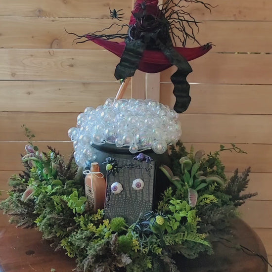 Enchant your Halloween display with a handcrafted Witch’s Cauldron Centerpiece that blends whimsical spookiness and rustic charm, perfect for tables, or storefront windows.
